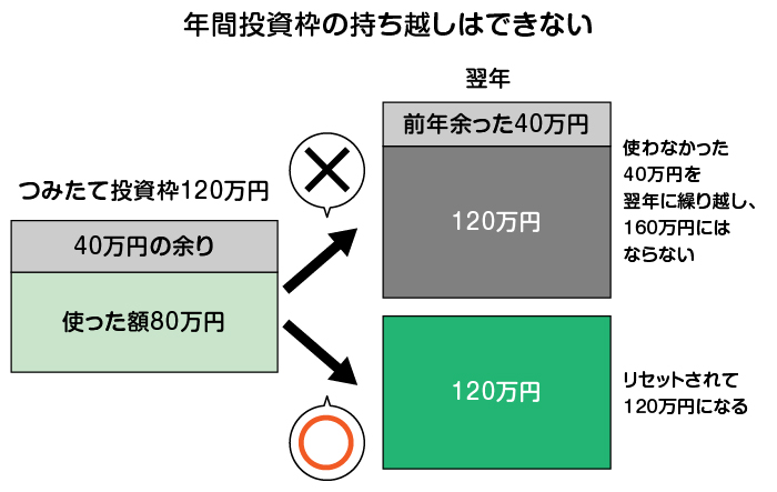 年間投資枠は持ち越せません。年間の利用額に関係なく、毎年リセットされます。