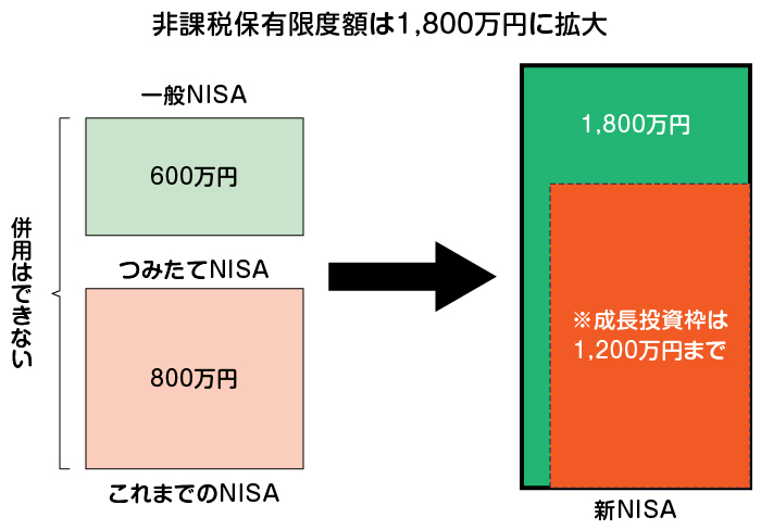 | 非課税保有限度総額 | 600万円 (一般NISA), 800万円 (つみたてNISA) | 1,800万円 (うち、成長投資枠は1,200万円) |