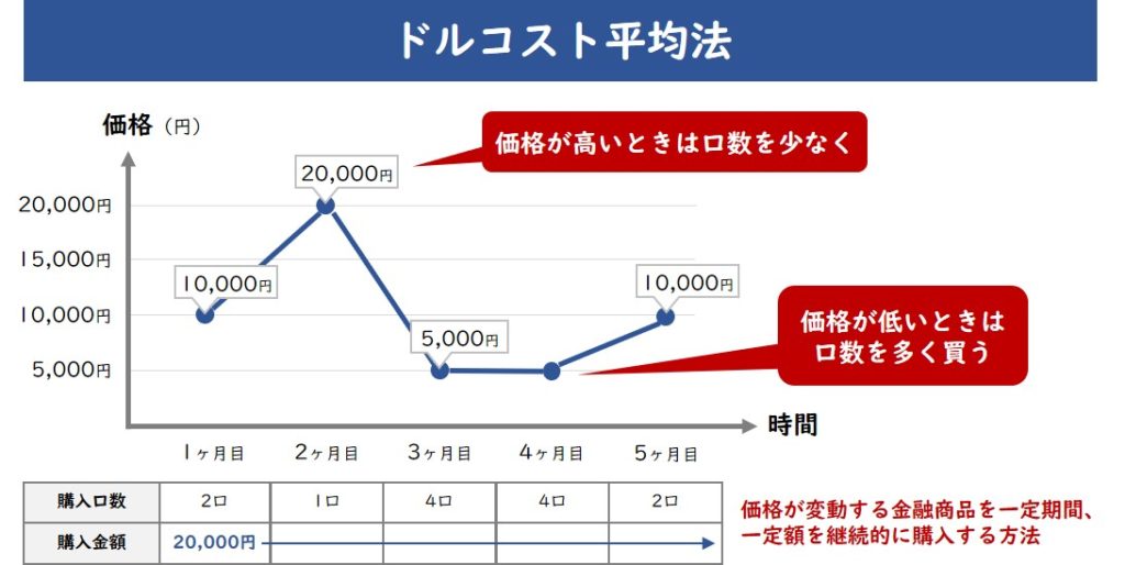 3. 時間の分散投資: ドルコスト平均法を用いて、定期的に一定額を投資することで、投資時の価格変動リスクを抑えることができます。市場が高騰している時期に一度に大きな投資を行うのではなく、定期的に少額ずつ投資することで、価格の変動に左右されずにリスクを分散できます。