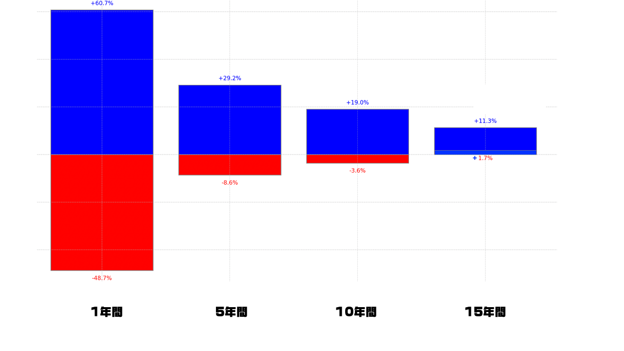1年だけ投資した場合をみると、リターンが最も高かった年は+60.7%、最も低かった年は‐48.7%と大きな差がありました。