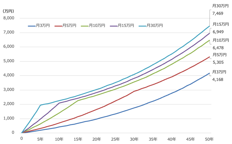 | 5年 | 50,000円 | 3% | 約3,260,000円 |