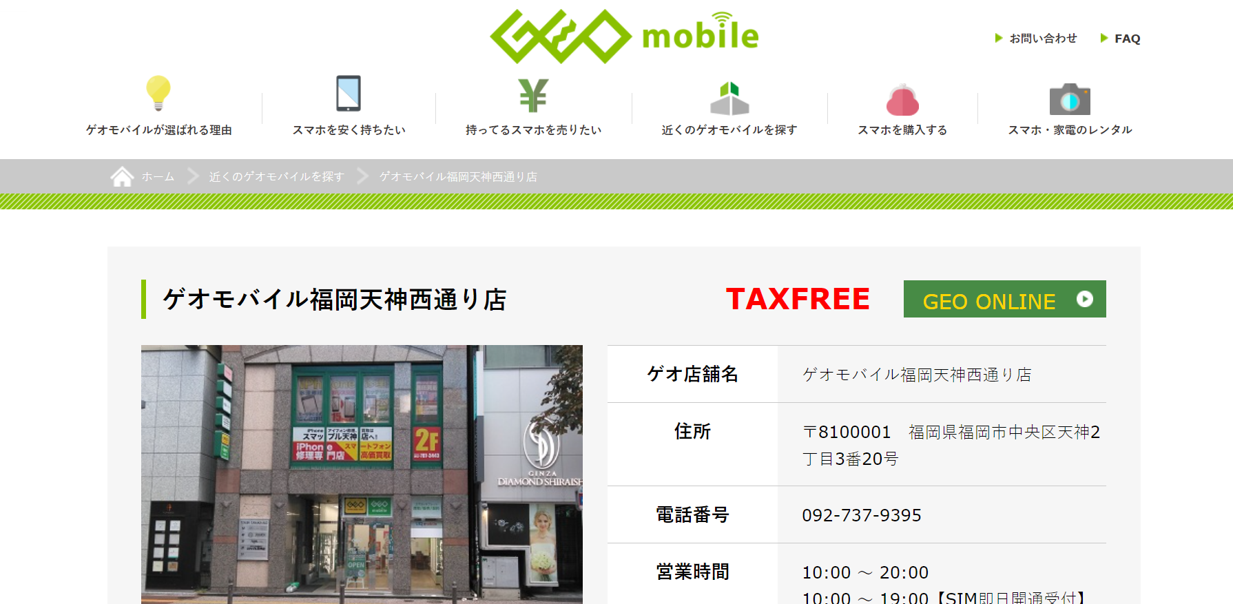 「ゲオモバイル福岡天神西通り店」はスマホの販売、買取、レンタルを専門に手がけるお店です。