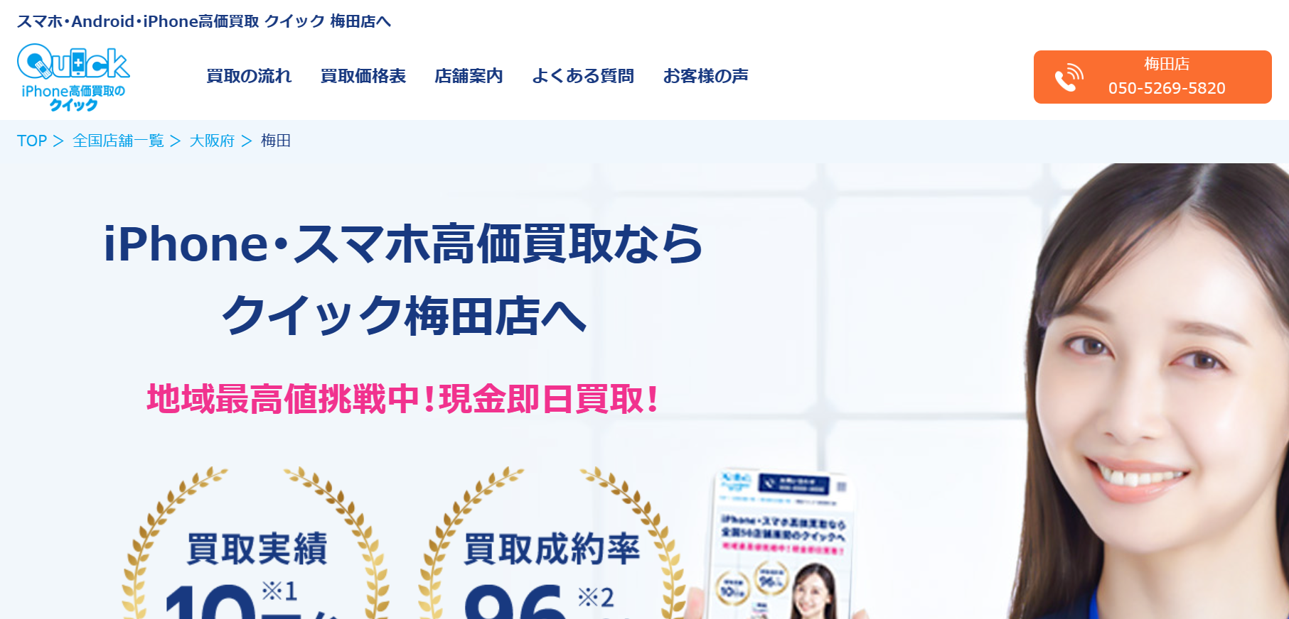 「クイック梅田店」は、iPhoneやAndroidスマホ、iPadなどのタブレットを専門に買取と修理を行うお店です。