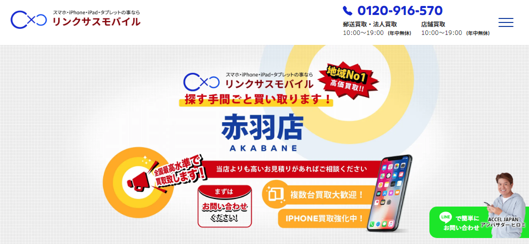 「リンクサスモバイル赤羽店」は、iPhone、Android、タブレットの買取を行っており、年中無休で営業しています。
