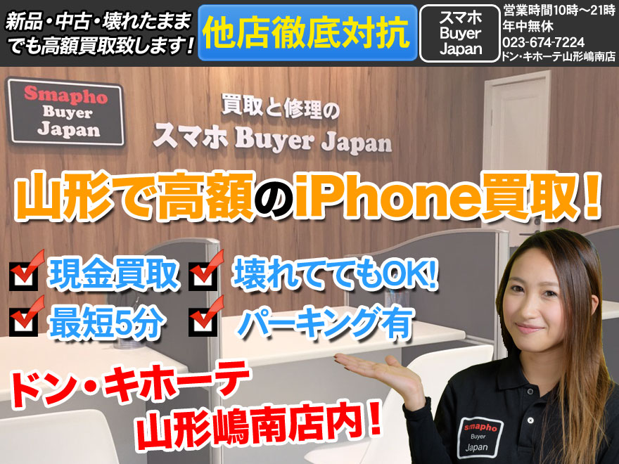 BuyerJapanドン・キホーテ山形嶋南店は、中古スマホ・タブレット・小型家電などの買取と修理を行っています。
